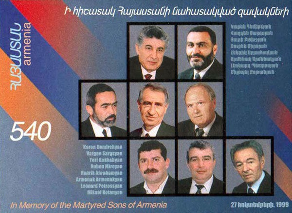 A stamp commemorating the victims of the terrorist attack on the Armenian Parliament on October 27, 1999 issued by the Republic of Armenia in 2000.