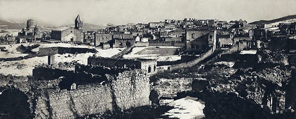 The Armenian quarters of city of Shusha destroyed by Azerbaijani armed forces in 1920 with the defiled Cathedral of the Holy Savior in the background.